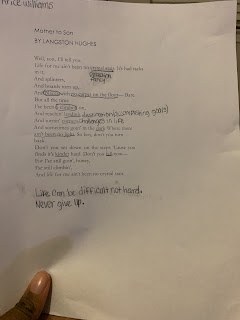 Today in class we read a poem called Mother to Son by Langston Hughes. I like this poem a lot because it is about a mother telling her son no matter how difficult life gets, do not give up. And I can kinda relate to that because my mom be telling me the same thing.